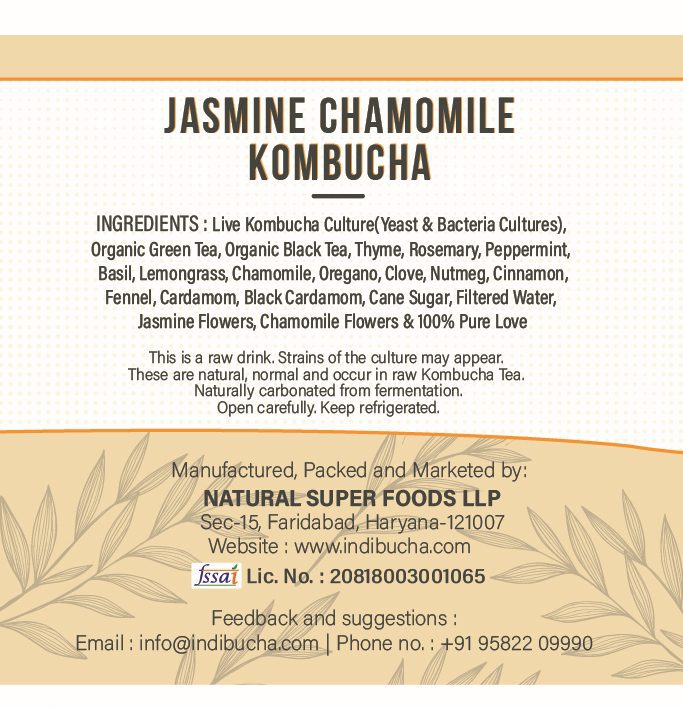 Live Kombucha Culture (Yeast & Bacteria), Organic Green Tea, Organic Black Tea, Thyme, Rosemary, Peppermint, Basil, Lemongrass, Chamomile, Oregano, Clove, Nutmeg, Cinnamon, Fennel, Cardamom, Black Cardamom, Cane Sugar, Filtered Water, Jasmine Flowers, Chamomile Flowers and 100% Pure Love.
